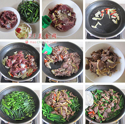 3、烧热锅,放入适量的油,煸炒韭菜花,微微发软变色后加入爆炒过的鸭胗,翻炒几下后加入盐等调味即可。