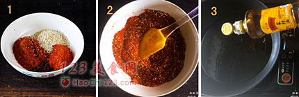 6、高温油(约250克)用勺子慢慢加入辣椒面中,同时搅匀辣椒面,让所有辣椒面都被高温烫油浸透,这是给给辣椒油烫出香味。