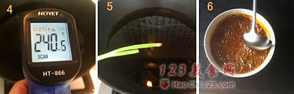 5、没有温度计,用土办法。选一根没有水的大葱放一点在油锅中,如果大葱很快就炸糊了就说明油温够了(葱一定要确定没有水,要不油会四溅)。