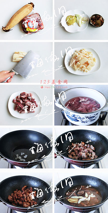 3、牛肉洗净血水后捞出沥干,切成大块。