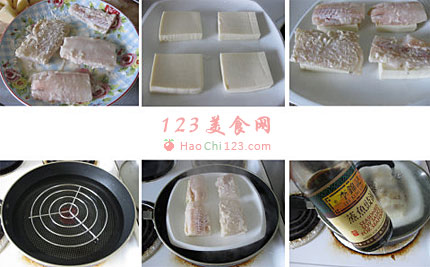 2、3、豆腐提前用盐水泡10min,切好豆腐片,将上好浆的鱼片放上。