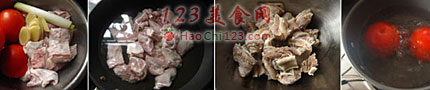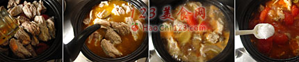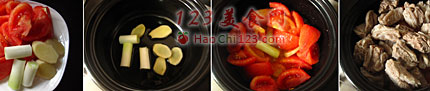 6、砂锅放入油烧热,放入葱与姜炒出香味,接着倒入切好的番茄翻炒至出汁,加入牛腩。