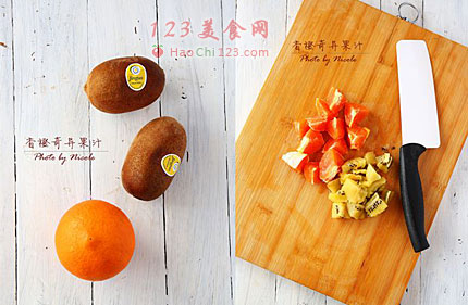 1、将橙子和奇异果一起放入水果豆浆机,加少许纯净水。