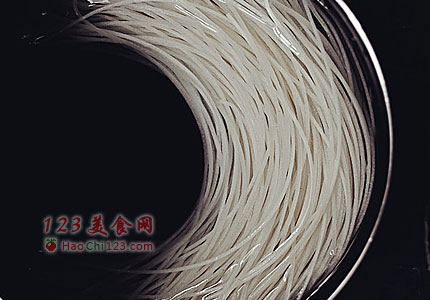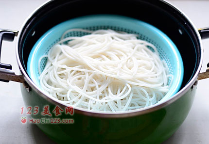 2、焯软熟透的米粉控干水分,放入碗中备用(米粉也可换面条,碱水面,河粉,薯粉等,随自己喜欢)。
