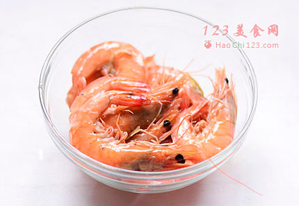 3、鲜虾洗净,抽去虾线,剪须,炒锅加热后滴入少许油,炒香蒜泥,倒入鲜虾炒至变色,调入适量盐入味,熟透可,盛出备用(翻炒过的虾比较香口,我更喜欢这样做,你也可以直接用煮沸的水焯烫虾)。