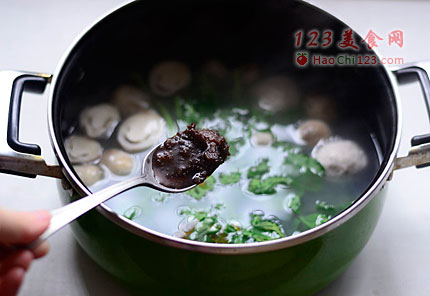 5、调入沙茶酱,盐,鸡精,适量油,西洋菜焯烫至软熟时先捞出放入装有米粉的碗中。