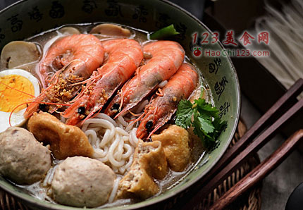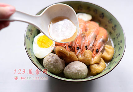 6、将熟鸡蛋切半,和所有煮熟的食材码入到米粉碗中,最后淋入锅中滚煮的汤料,撒入香蒜粒或香菜食用。
