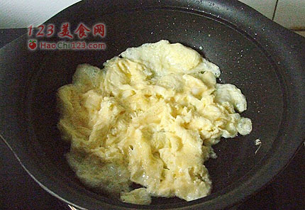 2、鸡蛋液搅打均匀,入热油锅中炒至成型,即可铲出。