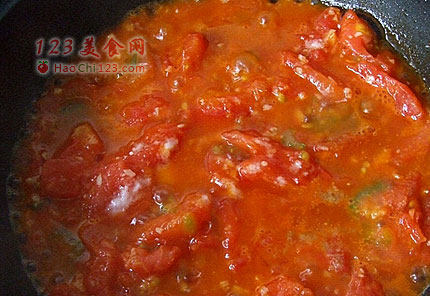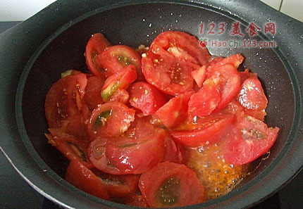 3、利用锅内底油,爆香蒜末;蒜香浓郁时,下入西红柿大火煸炒。