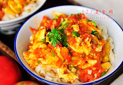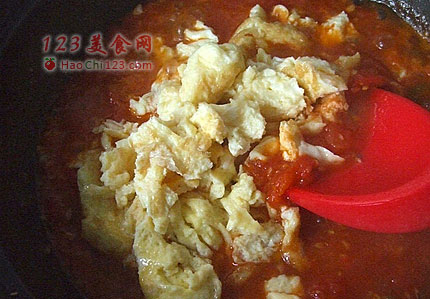 8、把做好的没加一滴水的西红柿鸡蛋卤盖在面条上,拌匀即可。[LaoYanHuo.com]