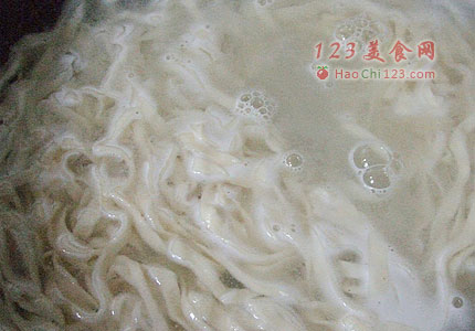 7、做卤的同时,另起一锅煮面,水沸腾后下入手擀面,煮开后点一次凉水,再次煮开后捞出,过凉,沥干。