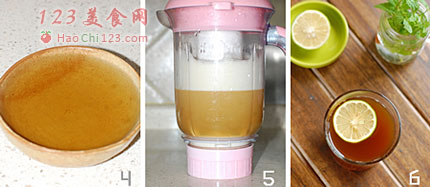 5、薄荷水和水果块入料理机打成汁(料理机要加滤网把水果渣过滤出来)。