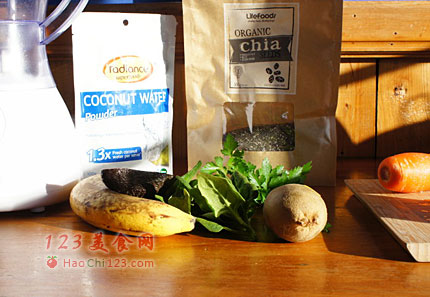 2、将半个香蕉掰成小块,随欧芹叶,菠菜,牛油果加入搅拌机,加入一杯水,两茶匙椰子粉。