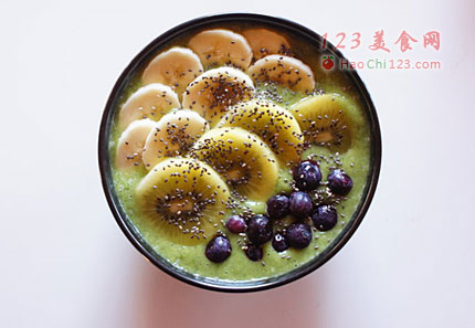 4、将思慕雪倒入大碗里,将剩下的半个香蕉切片,奇异果切片。用这些和少许蓝莓随意点缀,最后撒上奇异籽。
