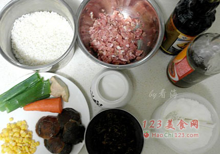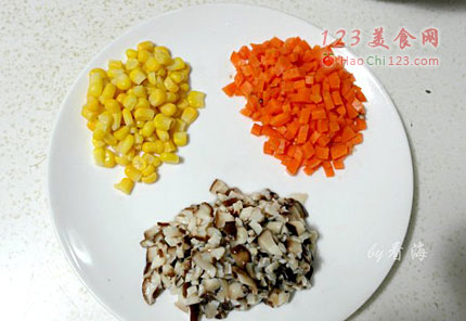 2、胡萝卜、香菇切碎,玉米焯水后捞出沥干水份备用。