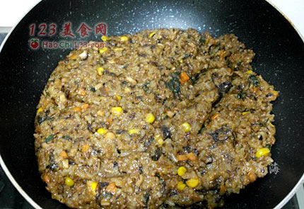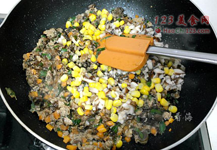 3、锅内入油,先倒入胡萝卜碎翻炒;再依次加入腌好的肉馅香菇碎和玉米粒,翻炒均匀。