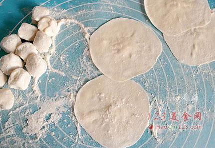 6、松驰好的面团分成适当大小的面脐子,按成饼状,擀成薄饼皮。