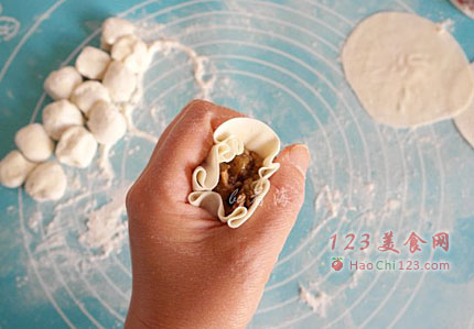 7、取适量糯米馅放到面皮中间,右手的虎口将烧麦颈部缓缓收紧。