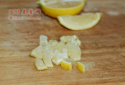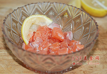 4、取一片柠檬挤出汁水,加盐把三文鱼丁腌制几分钟备用。