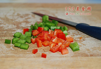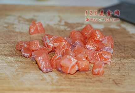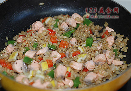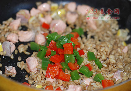 7、中火先下三文鱼丁煸炒;再加入熟燕麦、青红辣椒丁、柠檬丁一起煸炒。