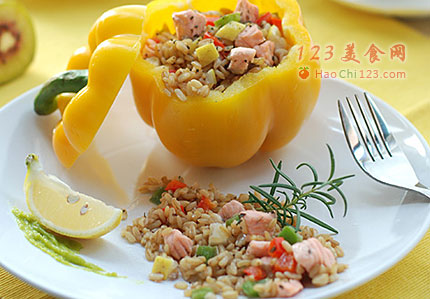 4、这道柠香三文鱼燕麦加入了富含不饱和脂肪酸的三文鱼和富含维生素E的燕麦,伴以柠檬和罗勒清香,不仅味道鲜美口感丰富,而且营养配比上也尤为均衡。将中国古老的粮食作物和西餐常用的三文鱼等食材一起细作,很是符合现代人推崇的低脂健康饮食观。[LaoYanHuo.com]