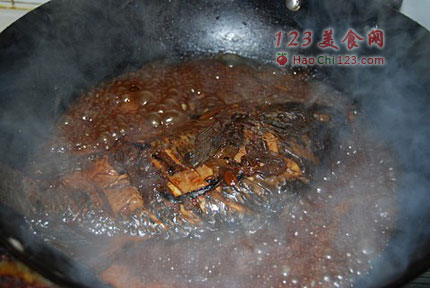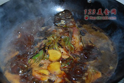 3、锅中倒入一定量的水,最好是没过鱼身,然后将醋、草菇酱油、黄酱倒入锅中,记住不要加盐,因为黄酱和酱油都含盐,盖上锅盖文火慢炖,记住一定是慢炖,炖10分钟就行,这样可以完全去掉鱼的腥味,让作料的香味沁入鱼肉之中。
