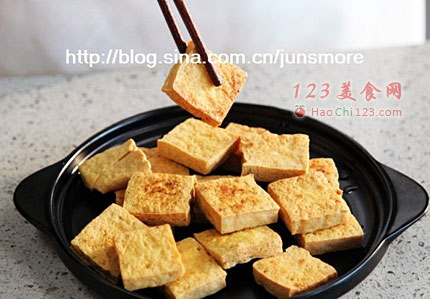 3、接着就可以开始制作了。在利仁电火锅里倒入植物油,大火将油烧热后转中火。将豆腐放入锅里,炸至金黄色。炸好的豆腐放在碗里备用。