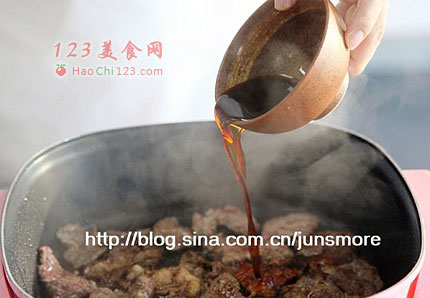 4、将锅里的油倒出。中火将锅加热,放入黄油,黄油烧化以后,依次放入牛肉片,煎至变色。在牛肉片里倒入酱油,再撒上白糖。