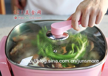 6、最后,盖上锅盖,大火将锅烧开以后转中火继续煮5分钟,就可以了!在吃的时候,将火力转为小火,使火锅保持沸腾。