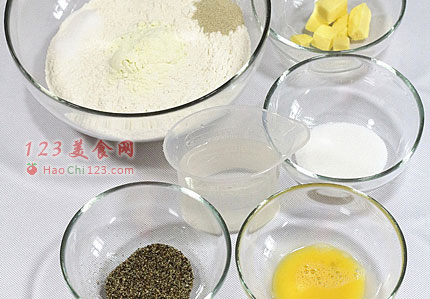 2、将除黄油和黑胡椒外的所有原料放入面包机内,启动“和面”程序,揉成稍具光滑的面团,加入软化的黄油,继续揉至扩展阶段,最后加入胡椒粉和面团揉至均匀即可。整个“和面”过程大概需要45分钟。