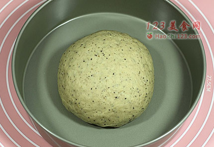 3、揉好的面团放入8寸不粘模具内,盖上保鲜膜,按下烤箱的“发酵”按钮,进行基础发酵,至原来面团的2倍大小,约需20分钟。