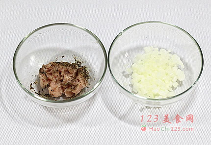 4、趁着发酵的功夫,炒内馅儿。白洋葱切成小丁,肉馅用盐和黑胡椒粉搅拌均匀。锅内入油烧至五成热,放入肉馅炒至颜色变白盛起,倒入洋葱丁快速翻炒数秒,最后再倒入肉馅一起翻炒均匀,盛起放凉备用。