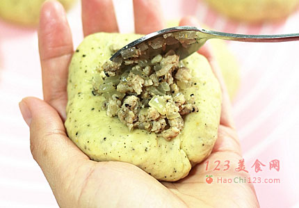 6、取一个面团,按平,包入肉馅儿,收口滚圆,放入8英寸的圆形模具中,盖上保鲜膜,启动烤箱发酵程序,进行最后发酵,约15分钟。