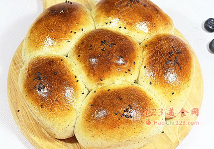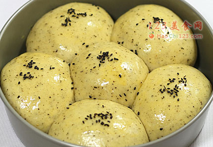 7、取出发酵好的面团,在面团表面薄薄地刷上一层蛋液,撒上黑芝麻做装饰。
