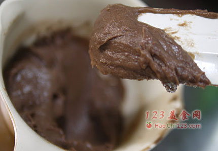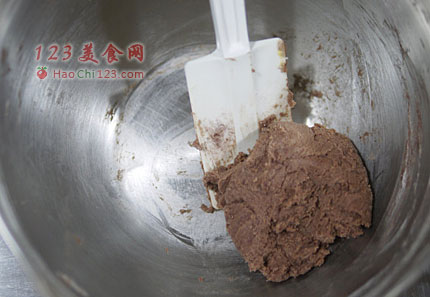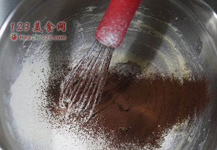 6、筛入高粉和可可粉用刮刀搅拌均匀。