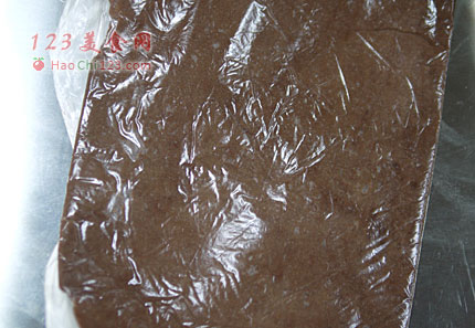 4、放在保鲜膜上,隔着保鲜膜擀成约15×20cm左右的长方形(厚度约2-3mm),移入冰箱冷藏备用。