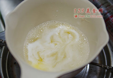 5、泡芙面团材料中的水、黄油、盐、糖放入小奶锅中火煮沸关火。