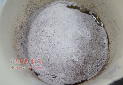 7、开小火,加热混合物至面团水分减少干燥不粘,锅底少量面糊结皮(我用的不粘锅,这个现象出现不明显)。