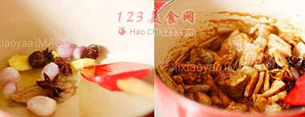 2、锅内放油烧热,加入葱、姜和八角桂皮等炒香,加入酱料炒出香味后加入牛什锦翻炒均匀。