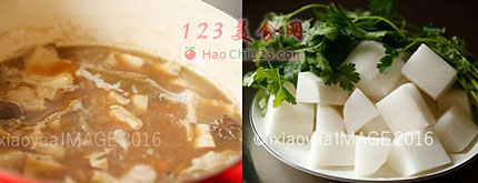 3、加入足量热水烧开,水的量没过牛什锦多一些,盖上盖子焖煮30分钟,如果加萝卜的话,这时可以洗净切块用清水煮软。