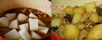 4、加入煮软的萝卜块再焖15分钟,大火收汁即可。汁不要收得太干了,留一半的汤汁,用来浇面或者粉都是很赞的。