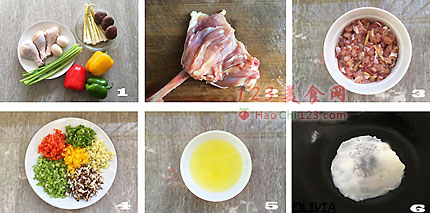 4、香芹、笋尖、香菇、彩椒和青椒洗净后,切成大小相近的碎丁。