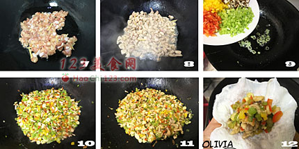 10、大火翻炒均匀,放入鸡肉粒。