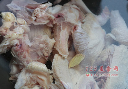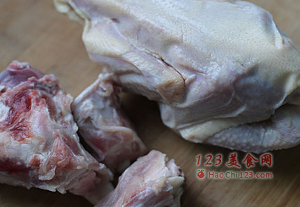 2、锅中加清水下入鸡块、棒骨焯水捞出备用。