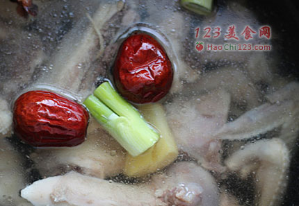 3、准备好香叶、八角、葱、生姜,红枣。将焯过水的鸡块、棒骨连同调料一起放入锅中,加纯净水没过食材。