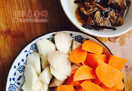 5、炖煮35分钟左右,点击中途开盖键加入水发榛蘑、切块山药、胡萝卜盐。盖盖继续至整个煲汤模式结束。