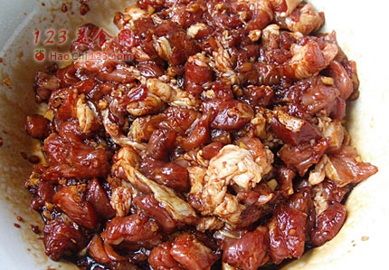 2、猪肉切成丁,加生姜末、生抽、老抽、白胡椒粉和料酒,拌匀,提前腌制下。