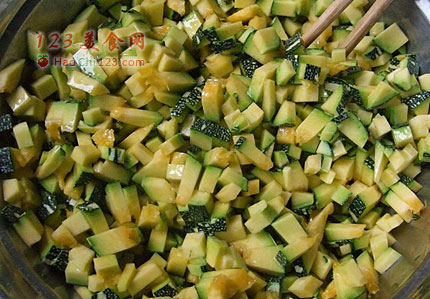 3、嫩南瓜去瓤,切成大小均匀的丁;先用油把南瓜丁拌匀。