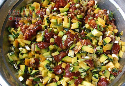 3、拌馅的时候,为了让瓜少出水,出水慢,先要用油把瓜丁拌匀;而且调馅时,尽量不要再添加液体的调味。