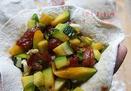 4、用瓜做馅,或多或少会析出水分,所以最好的方法是把面皮擀好以后,以后再调制馅料,这样拌好的馅料可以马上包,出水最少,易于操作。